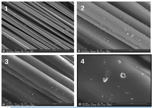 上圖1~4是纖維樣品在不噴金,低真空模式下拍攝的圖片。1、2為背散射圖像,3、4為二次電子圖像,在兩種圖像模式下,Axia均表現(xiàn)出優(yōu)異的成像功能。AxiaChemiSEM提供的低真空模式,可調(diào)節(jié)壓力到zui高150Pa,支持各種不同的樣品。