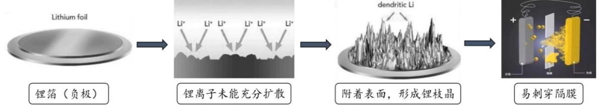 鋰離子電池發展的核心難題是熱穩定性以及鋰枝晶引發的安全問題。在鋰電池充電過程中鋰離子還原形成的樹枝狀金屬鋰(也稱為鋰枝晶),鋰枝晶在負極表面附著,生長到一定程度會刺穿隔膜,導致內部短路,引發起火。如果發生折斷,會產生“死鋰”現象,影響電池容量。