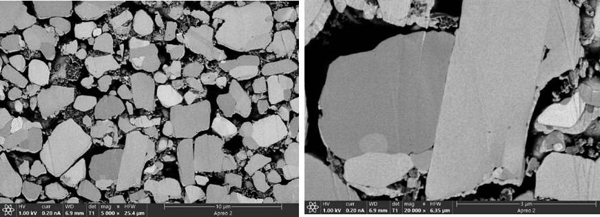 圖3(左)正極極片截面形貌;(右)NCM顆粒截面細節形貌