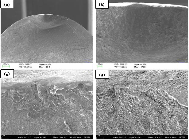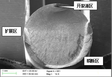 5.1宏觀觀察:斷口開裂源位于樣品外彎局部部位,裂紋擴展區宏觀上呈放射狀,表明此階段疲勞擴展相對較快。斷裂區位于斷口開裂源相對的另一側邊緣呈一定角度,有明顯的剪切特征。
