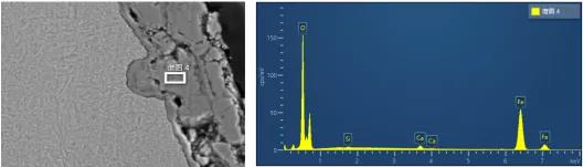 橫截面和縱截面外彎處即開裂源對應部位均觀察到表面覆著一厚度約15μm的不致密脆性層,經牛津能譜 ULTIM MAX 100檢測為氧化鐵層,見圖4。