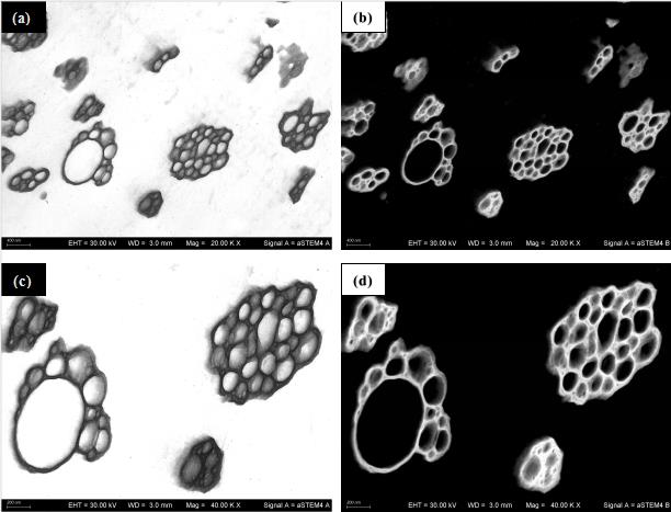 圖2 STEM圖片:(a)明場20k;(b)暗場20k;(c)明場40k;(d)暗場40k;