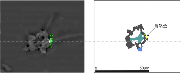 在電鏡下觀察可知,該金礦物粒度很細(1.7×2.186μm),屬微粒金,呈角粒狀分布在多礦物相的顆粒邊部,見圖3。連生金礦物的顆粒為以石英、長石為主,含少量白云石、閃鋅礦、金礦物的多礦物相顆粒,顆粒粒度為20.64×21.01μm,金礦物連生在石英邊部,與微粒閃鋅礦相鄰。所以,這粒金從選礦的角度劃分屬連生金,從金礦物與載體礦物的鑲嵌關系劃分,可能屬于裂隙金。