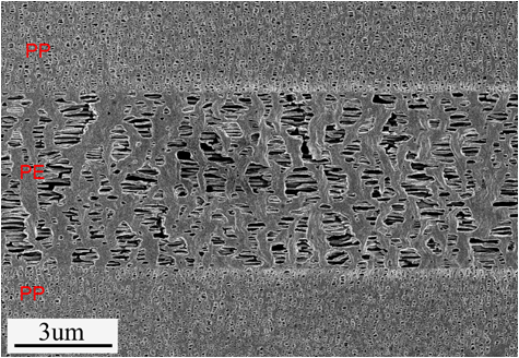 鋰離子電池隔膜截面(高分子膜有很強的延展性,想要制得光滑且無損的樣品斷口真實形貌使用常規方法很難得到,歐波同掌握了這一制樣工藝)