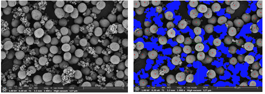 除此之外,匯鴻LIBMAS還可以精準識別圖像上所有大二次球顆粒與小顆粒,根據(jù)面積判斷計算大顆粒與小顆粒分布的均勻性。如圖8、9。
