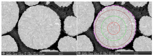 正極顆粒內部通常為二次球顆粒形成的多晶結構,導致正極晶格在循環(huán)中容易發(fā)生各向異性體積變化,而產生孔隙。我們將二次球顆粒拋開,發(fā)現(xiàn)循環(huán)充放電后的顆粒截面出現(xiàn)大量裂痕,如圖2。使用LIBMAS對截面孔隙進行識別,以輪廓中心點為圓心畫出同心圓,以各同心圓圓環(huán)內的孔隙率計算同心圓孔隙率RSD,見圖3。