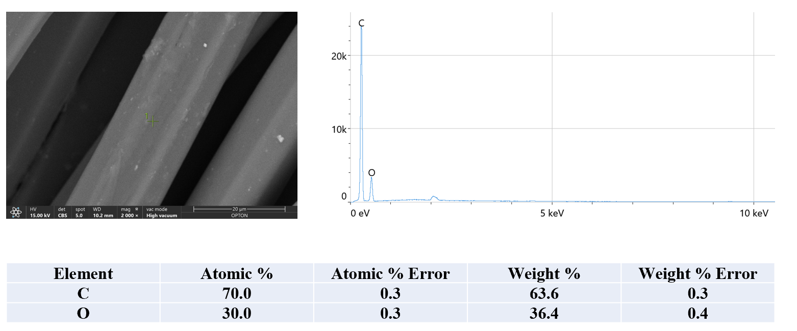 滌綸材料的導電性較差,在掃描電鏡中直接觀察需在表面噴鍍或者使用低電壓條件觀察,這對掃描電鏡的設備要求較高并可能會在一定程度上影響纖維表面的真實形貌。在本應用分享中,我們采用Thermo Scientific™ Axia™ ChemiSEM系統,使用獨有的低真空模式在高電壓條件下實現對不導電滌綸纖維樣品的大尺度觀察。同時,對滌綸纖維的化學成分變化進行高效、快速地分析。如圖所示,在15kV的高電壓條件下,樣品沒有發生熱變形,沒有荷電現象產生,圖像畫面清晰,表面細節明顯。