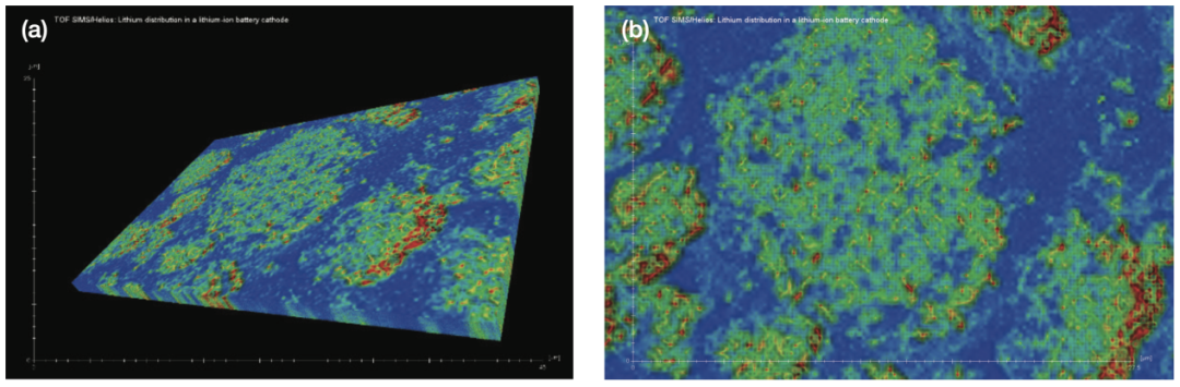圖5:左:三元正極材料內的鋰的三維分布;右:放大的二維SIMS圖像以顯示NCM顆粒內的Li元素分布