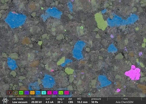 利用Axia ChemiSEM實時能譜,快速獲得了維生素藥片表面各種成分的分布情況,以及在控制藥片表面荷電的條件下,采用Axia低真空模式,無需手動安裝壓差光闌,軟件快速切換真空模式,保證了藥片的正常成像以及能譜分析。