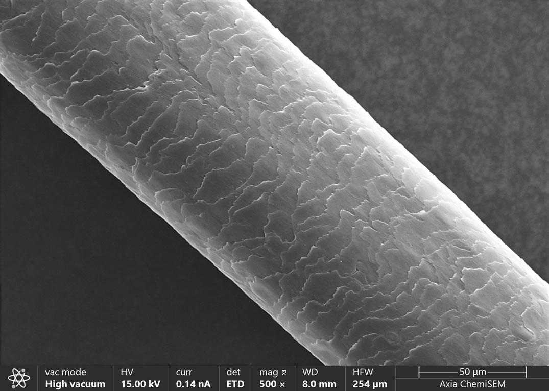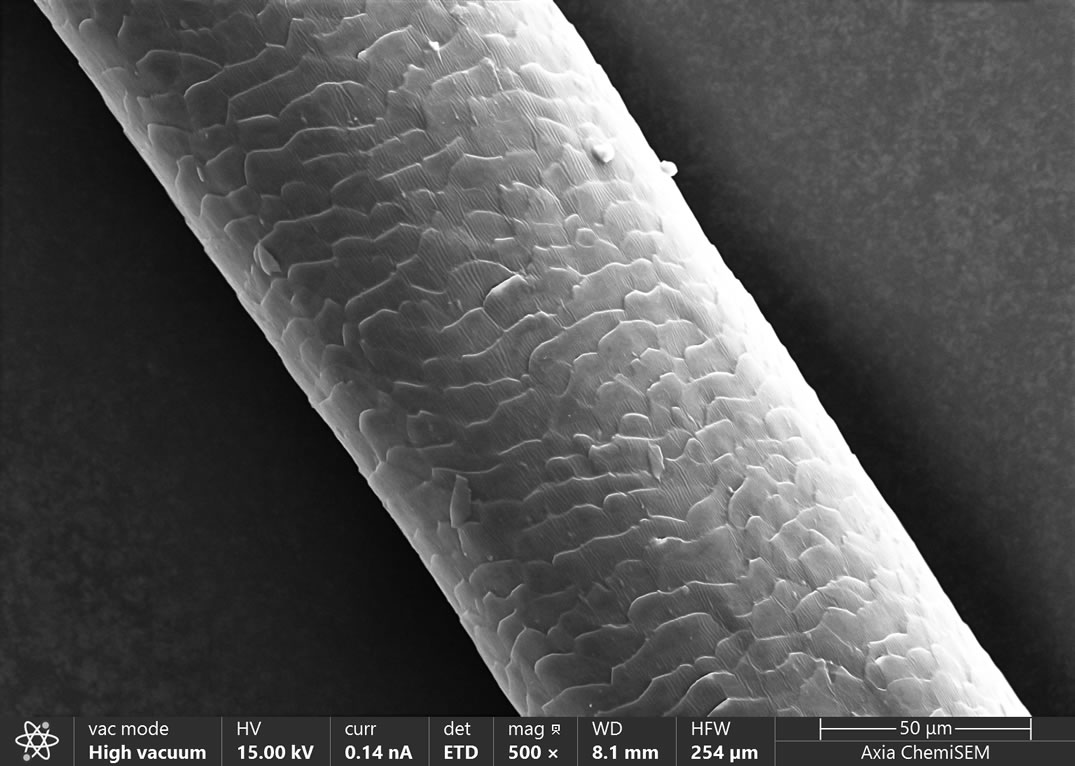 隨著時代的進步和發展,人們對美的追求已經不僅僅局限于臉部皮膚的保養,手部皮膚是否細嫩,頭發發絲是否呈現健康光澤,發量是否健康等都會影響一個人的整體氣質。頭發主要由表皮層、皮質層、髓質層等組成,表皮層主要由許多細小的鱗片重疊而成,這就是我們熟知的毛鱗片,它可以保護我們的頭發抵御外界傷害。由于人眼的分辨率有限,所以我們肉眼觀察不到微米級別的毛鱗片,借助Axia ChemiSEM落地式鎢燈絲掃描電子顯微鏡,可以幫助我們觀察頭發毛鱗片的形貌和成分,分析它的健康程度,從而協助我們有目的性地從外到內養護我們的頭發。