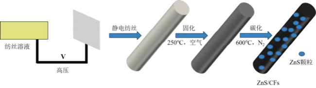 靜電紡絲法制備鋰電負極材料:ZnS 具有高達962 mAh g-1 的儲鋰理論比容量,被認為是新型LIBs 負極材料的理想候選。但其在嵌鋰/脫鋰過程中體積和結構的巨大變化及較弱的導電性極大地阻礙了ZnS 材料的實際應用。官鳴宇提出了采用靜電紡絲法制備硫化鋅/炭纖維材料(ZnS/CFs),并通過構造多孔結構和與FeS 復合的方法,優化ZnS/CFs的LIBs 儲鋰性能,獲得了系列具有良好儲鋰性能的ZnS/CFs 基復合材料,如下圖3。