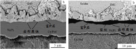 黑盤失效特征主要包括3個方面:焊接前Ni 層表面存在腐蝕狀裂縫,Ni層截面存在縱向腐蝕,如圖1所示;焊接后Ni層截面縱向腐蝕裂縫進一步加劇,IMC層與Ni(P)層之間可見明顯富P層(P含量為焊接前的2倍或以上),如圖2所示;焊點開裂發生在IMC層與Ni3P之間,斷裂后的鎳層表面平坦,基本無焊料殘留,且可見明顯泥裂,如圖3所示。