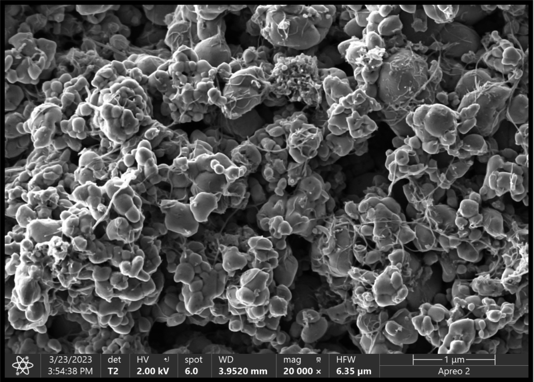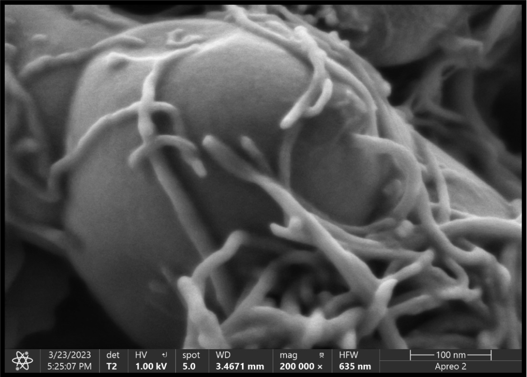 另外碳納米管相比碳黑等材料也具有更優(yōu)良的導熱性能,可以促進電極材料中熱量的傳遞和耗散,避免局部生成熱點影響電池體系的安全,碳納米管與電極活性材料相互纏繞也使電有一定的韌性,不容易在充放電過程中發(fā)生活性物質(zhì)的剝離。在用Apreo 2S掃描電子顯微鏡的T2高分辨二次電子探測器我們可以很清晰的觀察到CNTs的結構在磷酸鐵鋰正極粉體材料中很好地保留。