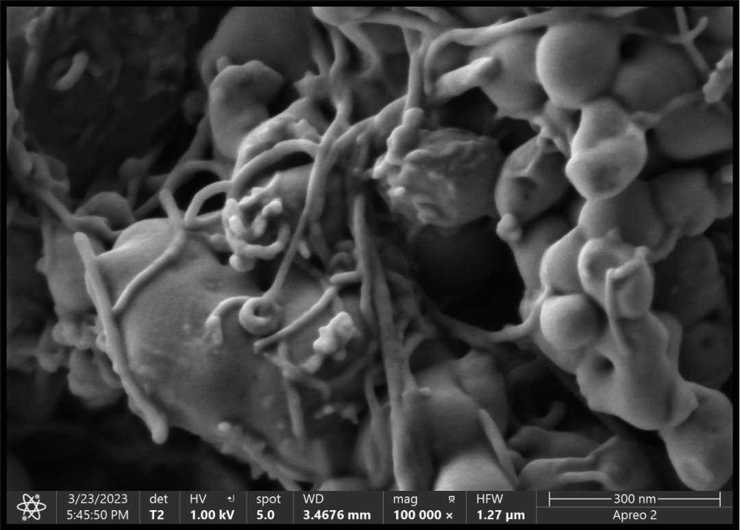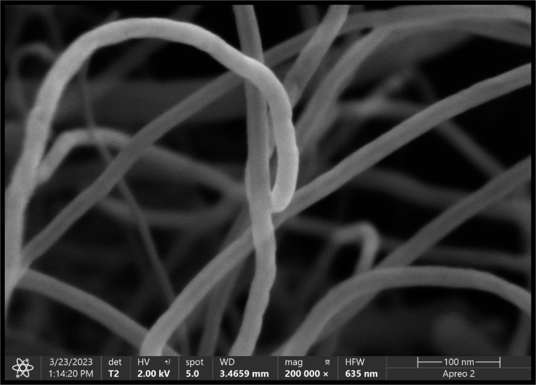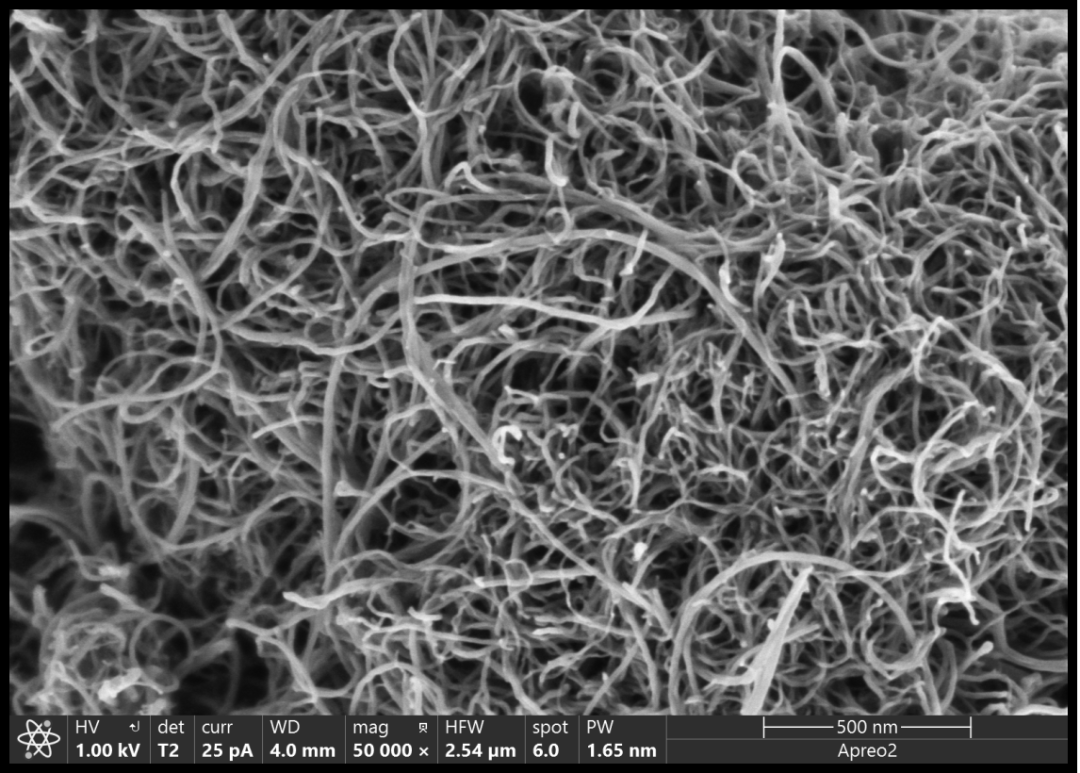 碳納米管既可以納米級一維材料,相互直接更容易搭接,形成導電網(wǎng)絡,在較低的添加量下得到性能良好的電極,用碳納米管作為導電劑,其效果明顯優(yōu)于碳黑。也可以用在LiFeO4、LiCoO2 等多種材料上面以提升電極的循環(huán)容量。同時其優(yōu)良的導電性能,可以在一定程度上克服許多正極材料電阻率高的缺點,提高電極材料整體的功率性能,可在較大電流密度下進行充放電。碳納米管的管徑非常的小,屬于納米級的微觀材料,拍攝難度較高。我們以一維的碳納米管為例,展示Apero2S在超低電壓和束流下的成像效果。