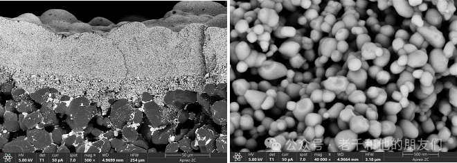 圖2 陶瓷過(guò)濾膜截面。低加速電壓不鍍金成像,可清楚的辨別支撐體上不同孔尺寸的2層氧化鋯過(guò)濾膜,膜層顆粒堆積的形態(tài)。圖注:5KV,束流50pA,賽默飛Apreo2 T1 探測(cè)器。
