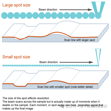 電子束錐在樣品表面形成的束斑大小(橫截面直徑)會(huì)影響:1)圖像的分辨率;2)產(chǎn)生的電子數(shù)量,從而影響圖像的信噪比和清晰度。在低倍放大時(shí),我們使用的束斑尺寸要比高倍放大時(shí)大。