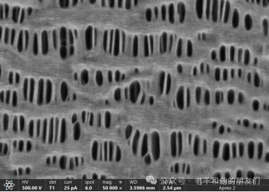 圖24 鋰電池隔膜。除了鍍膜處理,采用Apreo2的T1探測(cè)器可以直接對(duì)隔膜成像,相比鍍膜后的效果,表面細(xì)節(jié)可以辨別,但還不夠清晰。