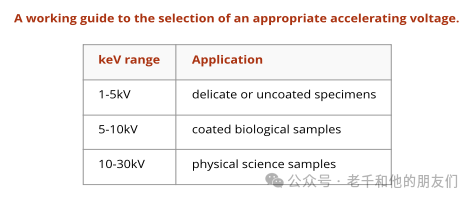 下表中提供了選擇加速電壓的一般操作指南。當(dāng)然,不同的電鏡設(shè)備,即使參數(shù)相同,成像效果也會(huì)有差異,要確定樣品成像的設(shè)置,需要進(jìn)行實(shí)踐操作。