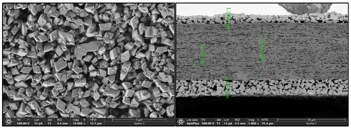 應用到新能源行業(yè)的另一類陶瓷是氧化鋁(Al2O3)陶瓷,Al2O3是一種無機氧化物,也是一種惰性材料。作為陶瓷涂層涂覆到鋰電池中的隔膜上,可以起到耐高溫、絕緣的作用,防止隔膜因電池內(nèi)部溫度過高熔化而導致的短路,避免可能因此發(fā)生的火災爆炸。隔膜表面的Al2O3陶瓷涂層以及截面的微觀結(jié)構(gòu)如圖5所示,陶瓷顆粒之間并未緊密堆積,而是形成,分布均勻的微孔結(jié)構(gòu),對鋰離子在正負極之間的轉(zhuǎn)移起到促進作用,同時在負極材料與隔膜之間形成一道屏障,防止鋰枝晶穿透隔膜導致的內(nèi)部短路問題。