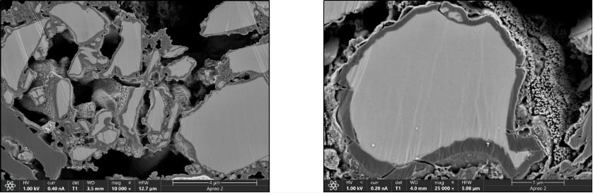 SEI膜會(huì)因?yàn)檠h(huán)過(guò)程中發(fā)生的體積變化而破裂,暴露出新鮮的電極材料,繼續(xù)與有機(jī)電解質(zhì)發(fā)生反應(yīng),從而不斷消耗電解質(zhì)。為了緩解這些問(wèn)題,有些研究人員通過(guò)改善工藝將硅顆粒的尺度縮小到亞微米級(jí)別來(lái)提高循環(huán)性能,比如通過(guò)CVD方法制備納米結(jié)構(gòu)硅顆粒。也有些研究人員在硅顆粒表面包覆無(wú)定形的碳,以提高其化學(xué)穩(wěn)定性。也就說(shuō)我們可以通過(guò)微觀結(jié)構(gòu)上的設(shè)計(jì)來(lái)改善材料的性能,賽默飛超高分辨場(chǎng)發(fā)射掃描電鏡Apreo 2便是我們了解材料微觀結(jié)構(gòu)的一大助手。