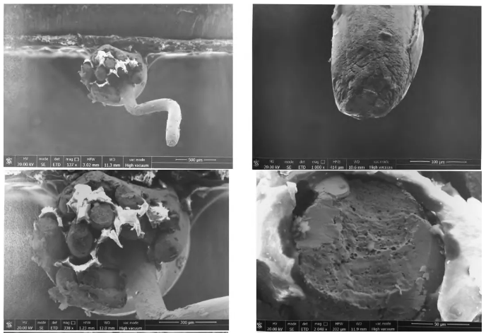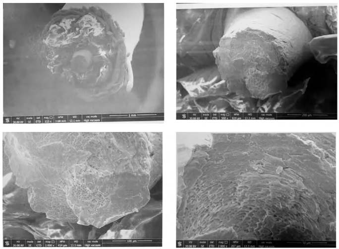 利用掃描電子顯微鏡下對斷口進行觀察,發現屏蔽網芯線的斷口均存在明顯的縮頸現象,且中部終斷區為韌窩形貌,從斷口形貌判斷,屏蔽網應為受到外力作用產生塑性斷裂;中心芯線的斷口較為平齊,表面為扭轉形態的剪切窩形貌,從其形貌判斷,中心芯線受到扭轉應力作用導致中心芯線扭斷,斷口微觀形貌如下圖所示。