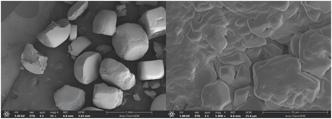 食用鹽的微觀結(jié)構(gòu)對(duì)其品質(zhì)有著重要影響。鹽的結(jié)晶形態(tài)、晶體尺寸和結(jié)晶度決定了鹽的溶解速度和溶解度,從而影響其口感和溶解效果。粗糙的結(jié)晶會(huì)使鹽的溶解速度變慢,而較小的晶體尺寸和更高的結(jié)晶度則會(huì)提高鹽的溶解性能和口感。因此,合理控制鹽的微觀結(jié)構(gòu)可以有效改善鹽的品質(zhì),使其更適合不同的食用和加工需求。如圖1所示,采用Axia ChemiSEM獲得的結(jié)果:低倍下鹽顆粒立體感十足,類似正方體,部分顆粒稍有破碎;高倍下鹽顆粒表面起伏不平,存在空隙,表面由許多小晶粒組成。