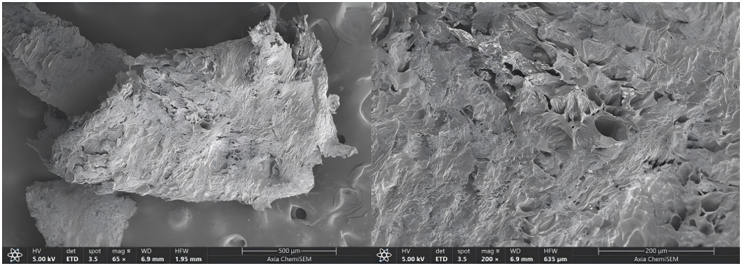 米的品質(zhì)取決于其內(nèi)部含有的淀粉和蛋白質(zhì)的比例和分布情況。微觀結(jié)構(gòu)中淀粉顆粒的大小、形狀和分布密度會(huì)影響大米的口感和黏性。同時(shí),蛋白質(zhì)的含量和結(jié)構(gòu)也會(huì)影響米的彈性和黏性。因此,通過(guò)調(diào)整米的微觀結(jié)構(gòu),可以有效提升米的品質(zhì),使其更加符合消費(fèi)者的口感偏好。如圖6所示,采用Axia ChemiSEM獲得的結(jié)果,微觀狀態(tài)下,可清晰觀察淀粉顆粒的大小和分布狀態(tài)。