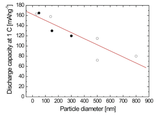 圖1: LiFePO4正極材料的放電容量與粒徑關系曲線圖