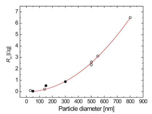 圖2:電極電阻與LiFePO4顆粒平均粒徑的關系曲線圖