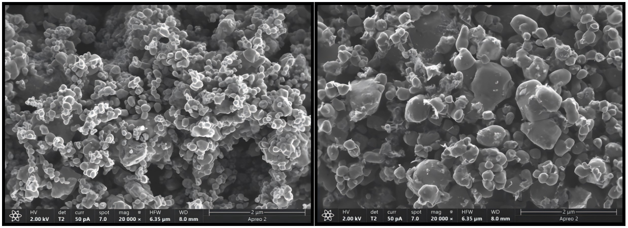 圖3:a(左)和b(右)為不同工藝制備的LiFePO4顆粒的SEM圖