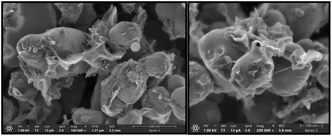 Apreo2掃描電鏡的鏡筒內的T2探測器為YAG材質,探測靈敏度極高,可輕松獲取低電壓下的高分辨圖像,非常適合表征LiFePO4顆粒的形貌特征,如圖3所示,使用T2探測器觀察到a、b兩個不同工藝條件制備的LiFePO4顆粒的粒徑具有明顯差異,研究者在此基礎上可繼續進行LiFePO4正極材料的電化學性能研究,從而幫助改善制備工藝。