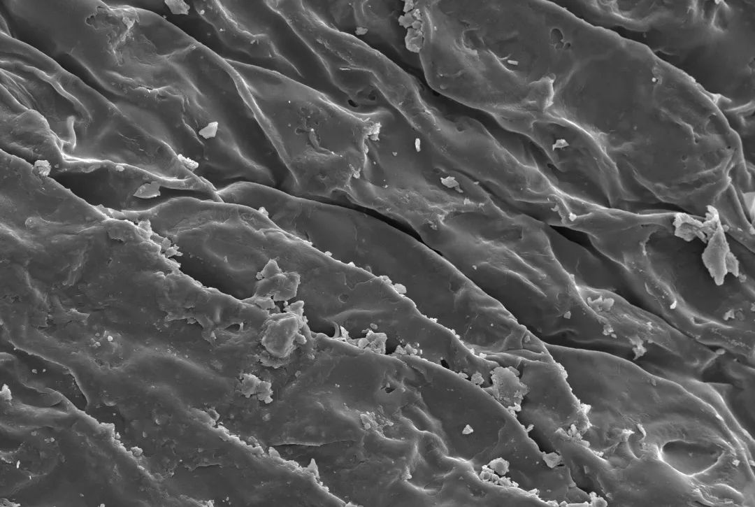 在掃描電鏡下,紅茶的葉片表面可以看到較多的細(xì)小顆粒和微小的氣孔,還有少量的絨毛。