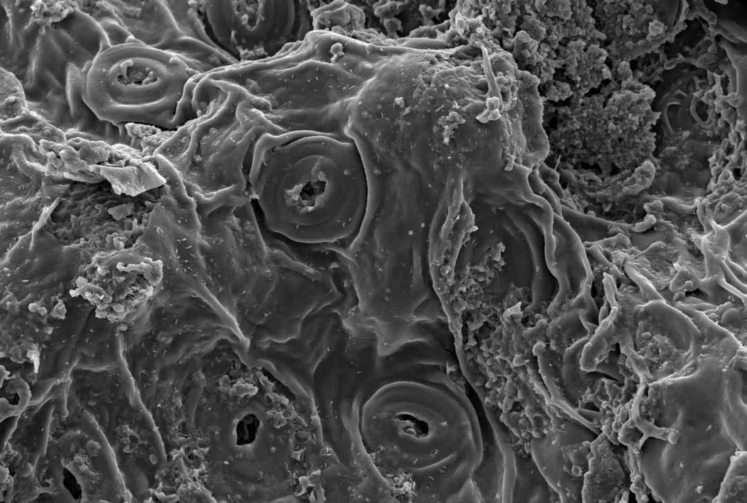 在掃描電鏡下,白茶的葉片表面可以看到大量的細(xì)膩絨毛和一些微小的氣孔,有些氣孔處于張開狀態(tài)。