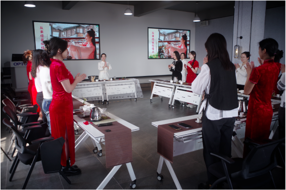 活動(dòng)現(xiàn)場,陽光透過窗欞灑落,空氣中彌漫著淡淡的茶香。資深茶藝師帶領(lǐng)參與活動(dòng)的女員工