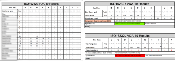 在ISO 16232中規(guī)定了按照顆粒尺寸大小將不同的顆粒進(jìn)行分類(lèi)輸出報(bào)告,同時(shí)可以根據(jù)尺寸分類(lèi)等級(jí)對(duì)其進(jìn)行零部件清潔度代碼(CCC)判斷。Aixa-Perception系統(tǒng)完全符合標(biāo)準(zhǔn)要求,自動(dòng)進(jìn)行顆粒尺寸等級(jí)分類(lèi),同時(shí)自動(dòng)進(jìn)行CCC代碼判斷,輸出結(jié)果合格或失敗。