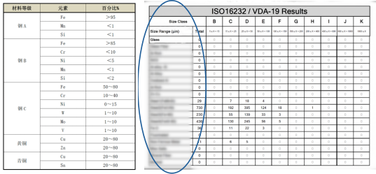在成分分類(lèi)上,光鏡通過(guò)偏光和非偏光圖像疊加,識(shí)別金屬光澤顆粒和非金屬光澤顆粒,但透明質(zhì)顆粒如玻璃不一定能識(shí)別出。同時(shí)當(dāng)顆粒呈現(xiàn)的表面不是很明亮,且表面被氧化或表面被油污等其他污染物包裹時(shí),仍呈現(xiàn)部分金屬反射或金屬光澤。而掃描電鏡則通過(guò)灰度閾值精準(zhǔn)識(shí)別,只要灰度閾值大于濾膜本身閾值則被識(shí)別,并可以通過(guò)EDS確認(rèn)具體成分。在GB/T 41481-2021中同樣提到了利用SEM- EDS的方式可有效識(shí)別顆粒成分,從而為材料的溯源提供支持。在Aixa-Perception系統(tǒng)中,提供了符合不同汽車(chē)主機(jī)廠的標(biāo)準(zhǔn)成分分類(lèi)庫(kù),為清潔度檢測(cè)溯源和異物確認(rèn)提供了ZUI有效和ZUI準(zhǔn)確的幫助。