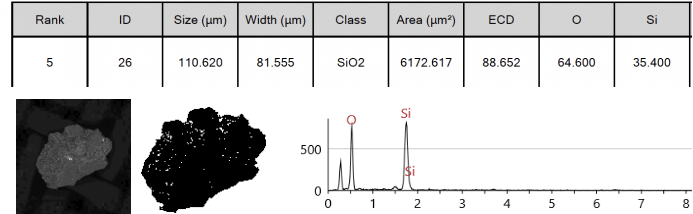 以往電鏡清潔度系統(tǒng)往往采用掩膜的方式識(shí)別顆粒形貌,再進(jìn)行顆粒邊緣尺寸測(cè)量,這種方式以極少的像素點(diǎn)確定顆粒物尺寸,在測(cè)量過(guò)量過(guò)程中會(huì)加大測(cè)量誤差,影響結(jié)果準(zhǔn)確性。Aixa-Perception系統(tǒng)以DUJIA的高分辨率識(shí)別方式,對(duì)每一個(gè)需要檢測(cè)的顆粒均以6K高分辨進(jìn)行拍圖,再測(cè)量尺寸。通過(guò)該種方式,既獲得了清晰的顆粒形貌像,同時(shí)會(huì)縮小尺寸測(cè)量的誤差,尤其是小尺寸顆粒。另外,針對(duì)每一個(gè)顆粒,Aixa-Perception系統(tǒng)會(huì)詳細(xì)展示其長(zhǎng)邊直徑、短邊直徑、面積、分類(lèi)和元素占比等信息。
