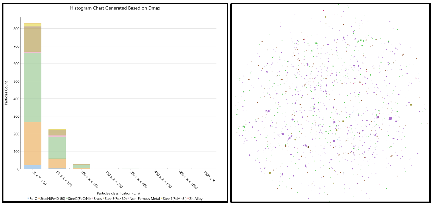 圖7 顆粒尺寸、成分分類(lèi)直方圖(左)和所有顆粒分布圖(右)