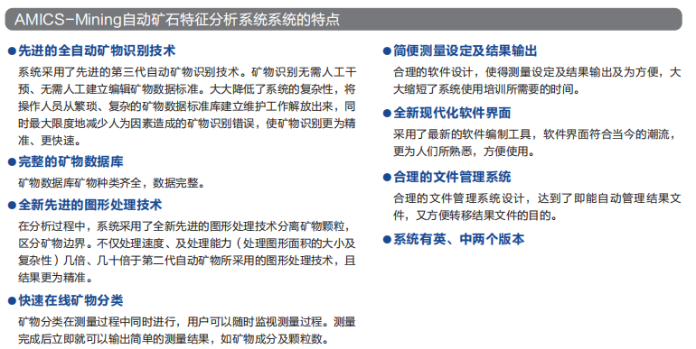 AMICS-Mining由工藝礦物學家團隊主持開發的第三代礦物參 數自動定量分析系統。該系統與高分辨率掃描電子顯微鏡結合, 廣泛適用于礦業、煤炭、地質科研等領域,是科學家及工程技術人員 對樣品進行工藝礦物學定量分析的有力幫手。